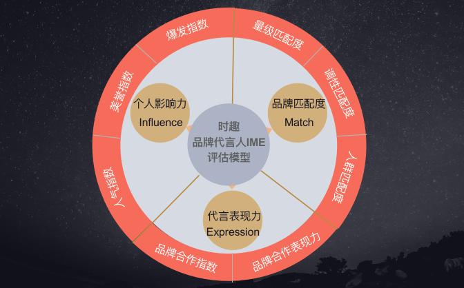 时趣通过长期对品牌和代言人的数据监测,基于明星个人影响力、品牌匹配度、代言表现力这三大重要维度,八大细分指标,构建了IME代言人评估体系,作为品牌科学选择代言人的策略依据。