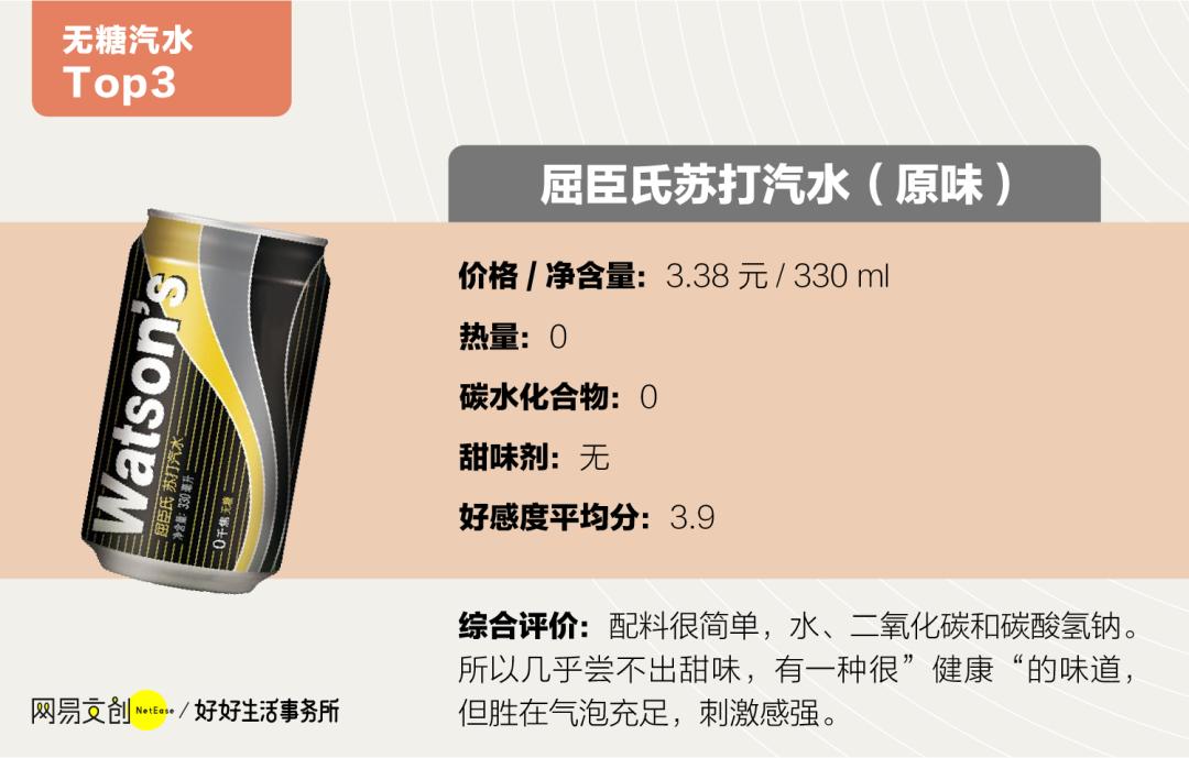 测评过程中,也有小伙伴吐槽某几款无糖汽水香精味过重。但从结果来看,食品添加剂的多少跟一款无糖汽水好不好喝,并没有多大关系。以下是无糖汽水好感度的前三名: