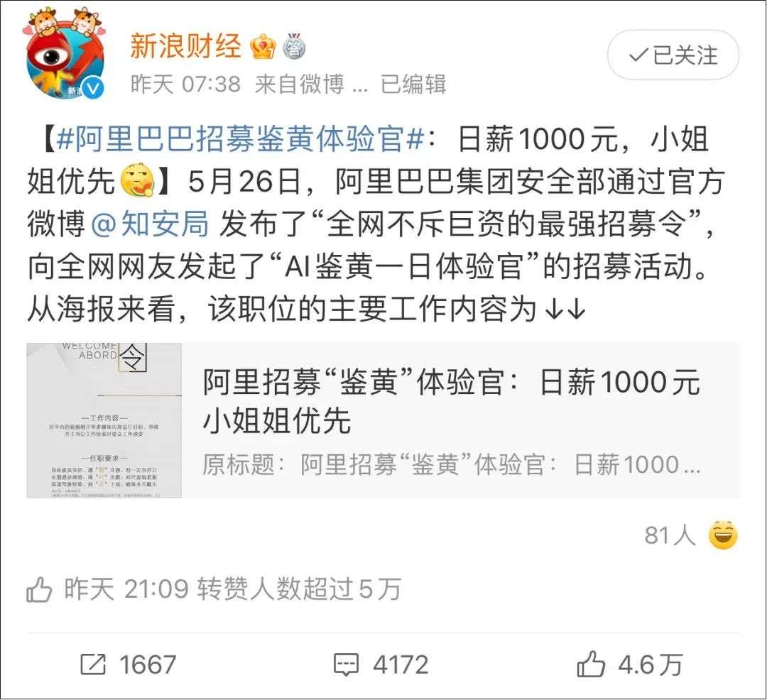 近日,阿里巴巴集团发布“全网不斥巨资的最强招募令”,向全网网友发起“AI鉴黄一日体验官”的招募活动,邀请网友亲自下场鉴“黄”,感受AI科技,并注明日薪达1000 元且小姐姐优先。