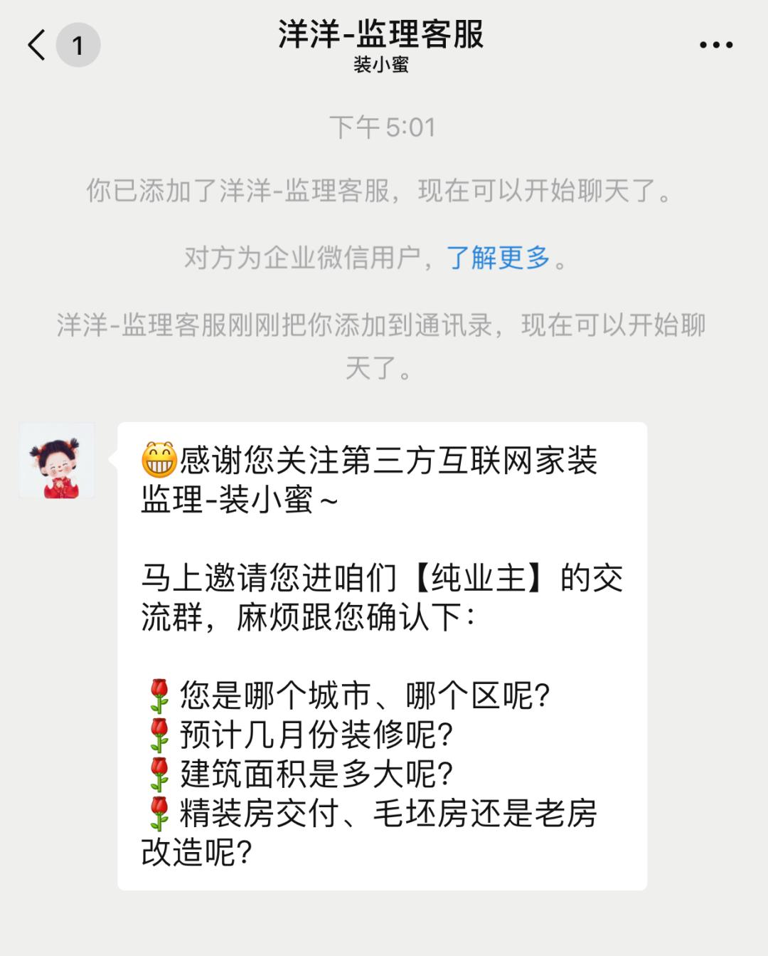 添加企业微信好友之后,就会收到企业微信的欢迎语了。欢迎语是引导客户回复关键信息,并且可以利用这些关键词对客户进行自动打标签。比如城市、区域、开工年份、室内结构和装修类型。