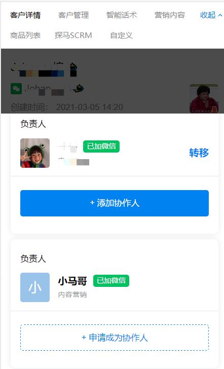 探马SCRM支持多员工共享一个客户的画像,使用添加协作人和申请成为协作人功能可以做到信息实时同步,增强工作效率。