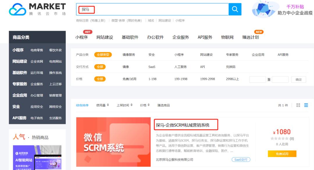 腾讯云市场,被称为“企业的云上市集”。探马SCRM作为SCRM行业内的头部品牌,此次入驻腾讯云市场,旨在深耕企业SaaS服务,丰富企业微信营销场景,这也是探马SCRM拓展市场的重要一步。登录“腾讯云市场”官网,在搜索框输入“探马”即可找到我们。