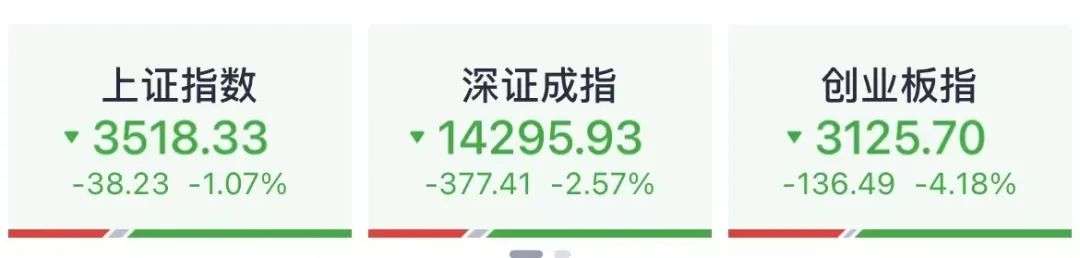 截至6月16日收盘,沪指报3518.40点,跌幅1.07%,成交额4106.09亿元;深成指报14295.93点,跌幅2.57%,成交额5216.04亿元;创业板指报3125.70点,跌幅4.18%,创3月8日以来最大跌幅。