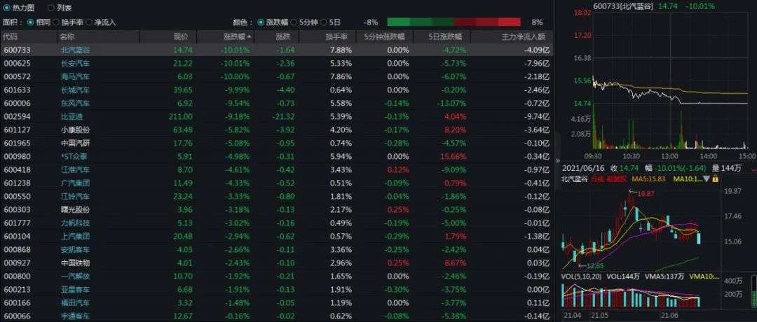 据wind数据,截至今日收盘,A股汽车板块指数下跌6.71%至11143.85点。长安汽车、北汽蓝谷(600733.SH)、海马汽车(000572.SZ)、长城汽车(601633.SH)相继跌停;东风汽车(600006.SH)、比亚迪跟跌下挫逾9%,逼近跌停。
