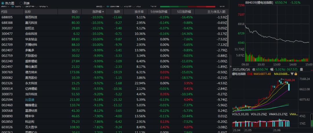 与此同时,锂电池概念盘中大幅下挫。其中,容百科技(688005.SH)、欣旺达(300207.SZ)、天赐材料(002709.SZ)、多氟多(002407.SZ)、华友钴业(603699.SH)跌停至收盘。龙头企业宁德时代(300750.SZ)股价下挫5.58%报收于420.18元/股,公司市值已回调至万亿元以下至9787.98亿元。Wind数据显示,截至收盘,锂电池板块指数下挫5.31%至6550.74点。