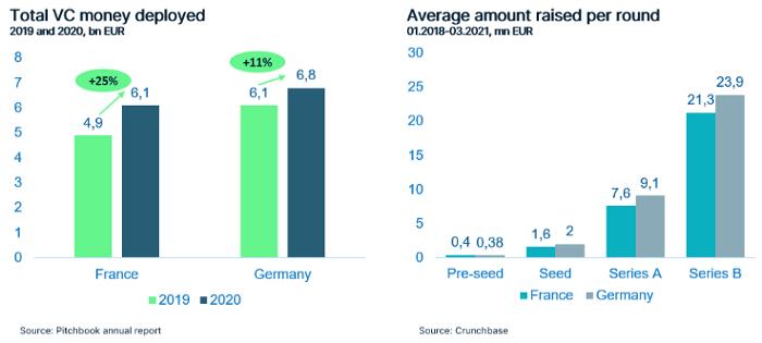 让我们先看看数字:2020年,投向法国德国的VC资金相差不多;但是与2019年相比,法国的变化大一些。从2019年到2020年,法国VC资金增加25%,德国增加11%。