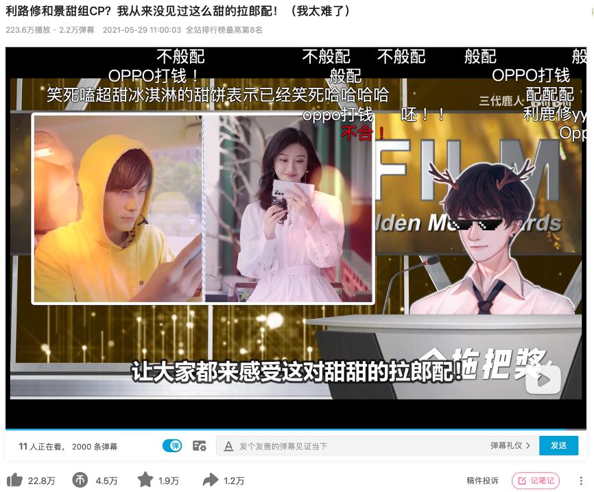 以与利路修频频互动的UP主“三代鹿人”为例。他在《创4》结束后发布的两个利路修相关视频中均植入了广告,其中5月29日发布的《利路修和景甜组CP?我从来没见过这么甜的拉郎配!(我太难了)》则直接以利路修和景甜拍的OPPO广告为创作素材。