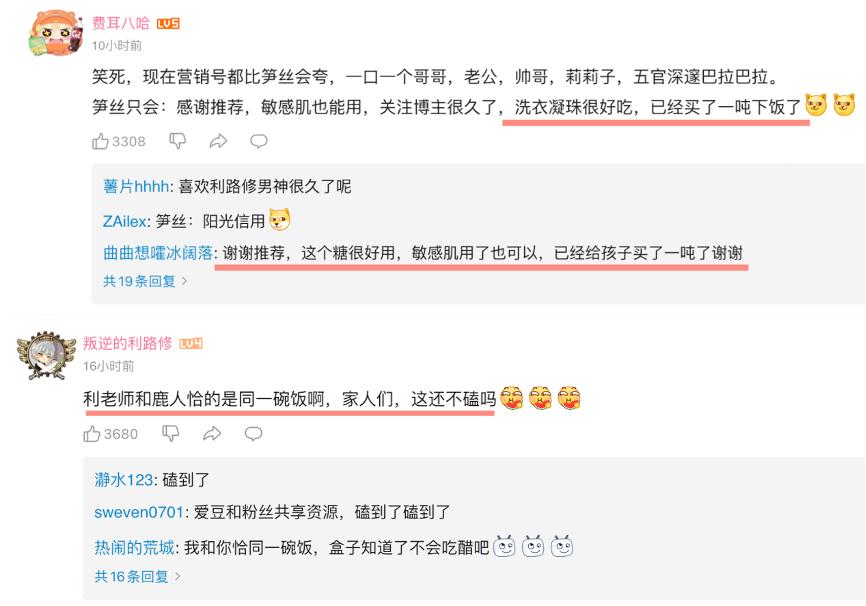 “你累吗宝?”、“宝他不累,拿的💰实在太多了”,这样的对话发生在利路修微博的评论区。