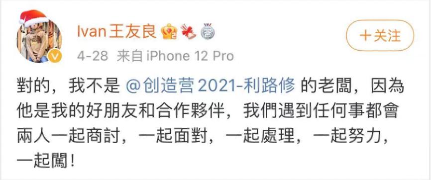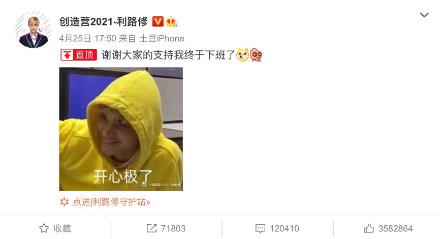 首先,这与利路修超高的人气和话题度密不可分。以《创4》结束后利路修发的第一条微博为例。至今,这条下岛感言的点赞量突破了350万,超过了最终组成INTO1的11人出道后第一条微博点赞量的总和。