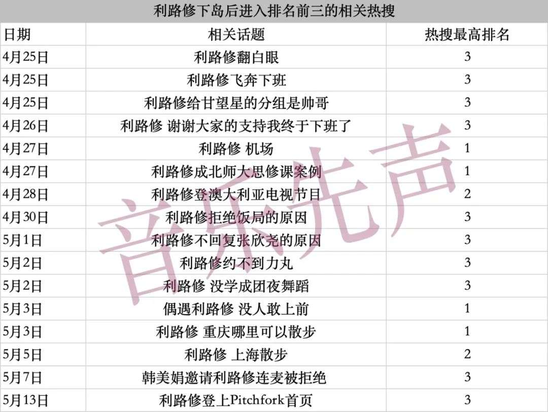 据音乐先声不完全统计,下岛至今,利路修共接了23条广告,拍了4家时尚杂志,上了2场综艺和1场音乐节。