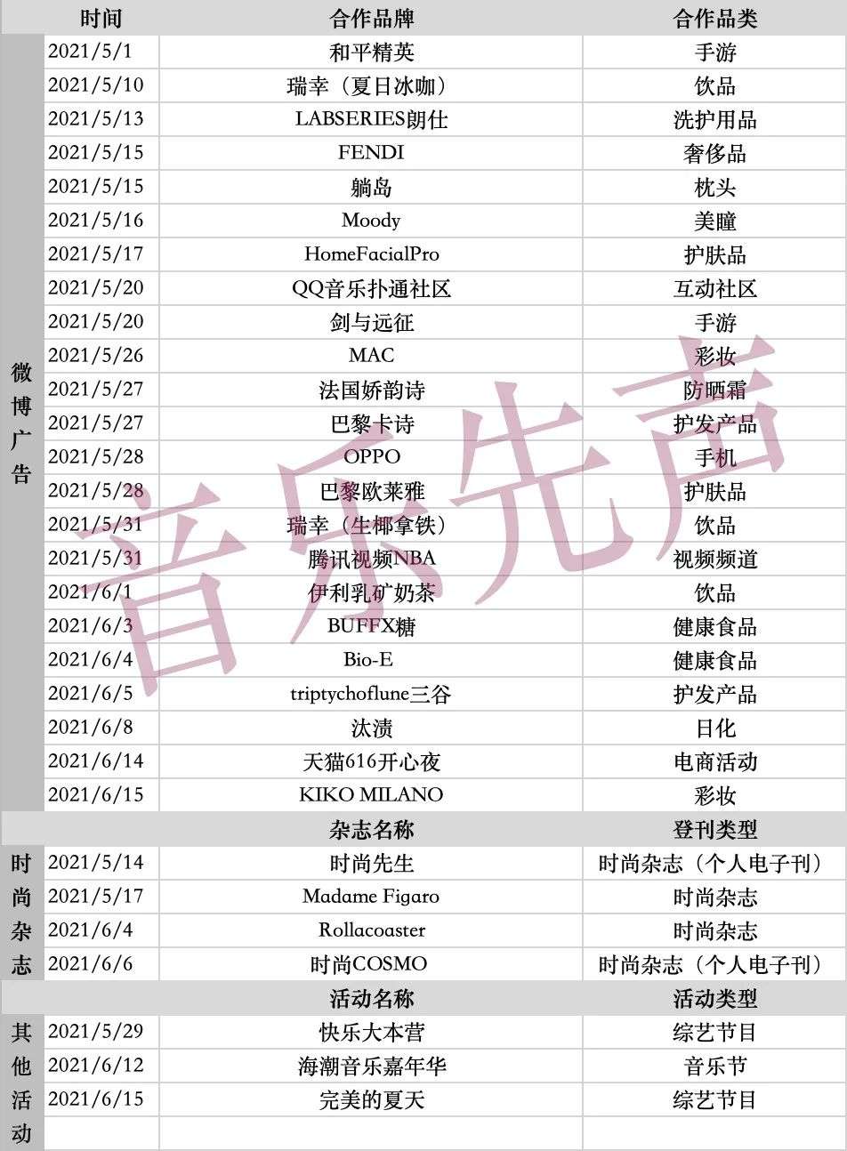 尤其是在5月10到6月15日的大约一个月里,广告、杂志拍摄和其他活动加起来一共是29个,平均下来几乎达到了每天一个的水平。从品类来看,利路修合作的广告代言也及其丰富,从手游、手机、美妆、日用品、食品饮品到奢侈品均有涉及,可谓是“恰尽百家饭”。