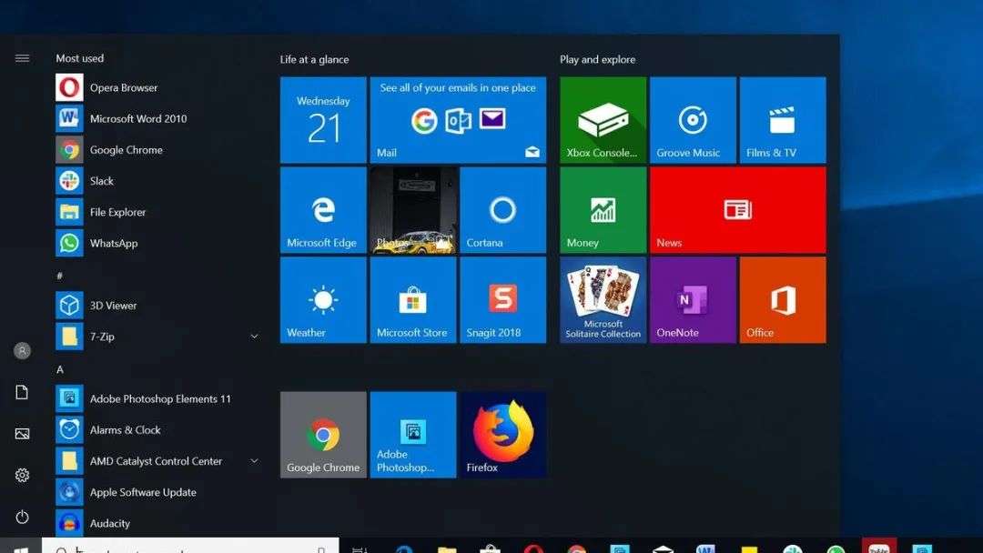 再对比看一下 Win 10 任务栏和开始菜单: