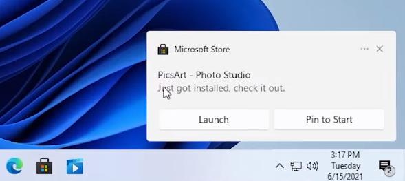 置顶的应用其实也包含系统推荐的主流应用,并不一定是已经安装好的应用。用户可以直接在开始菜单右键点击图标删除应用,也可以左键点击并不存在的应用进行安装。安装完成后桌面右下角会弹出这样一个通知: