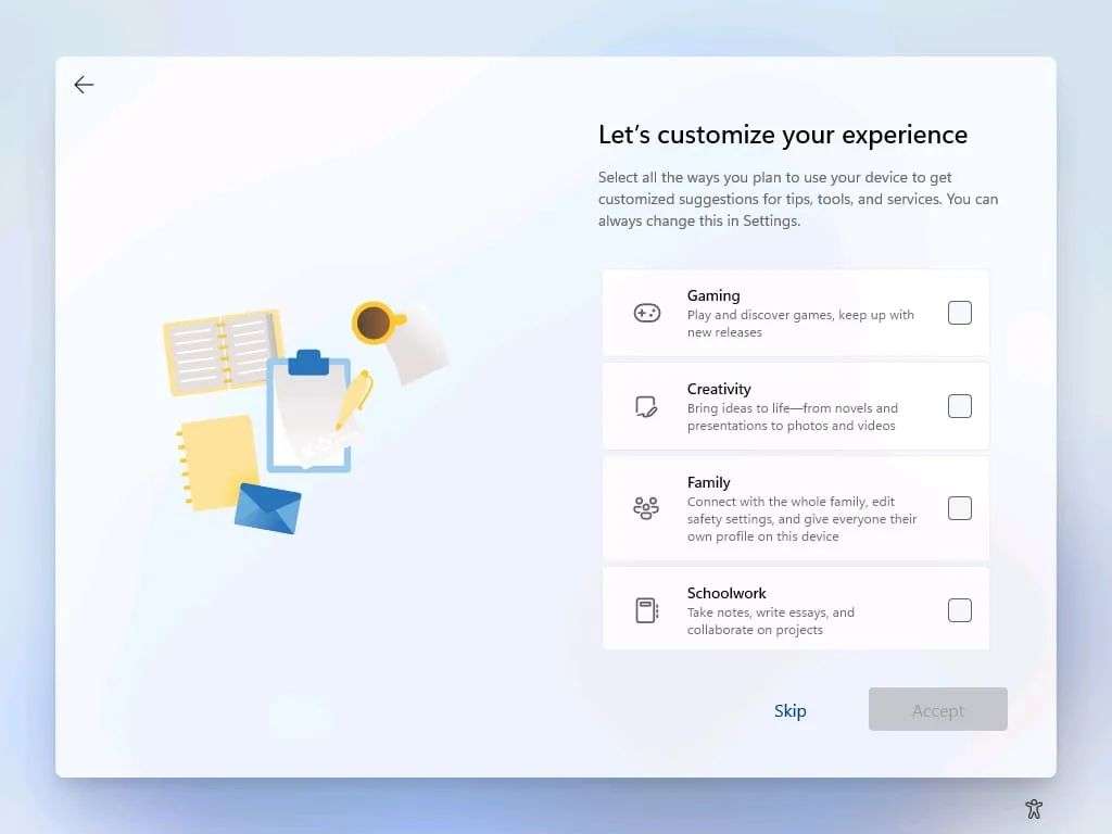 OOTB 流程还可以让用户按照不同的使用风格配置 Win11,包括游戏玩家、创意工作者、家庭使用和学生使用等等。比如选择游戏,系统就会在各个功能和 UI 上优先推荐和游戏有关的本地和在线内容;选择家庭使用的话,系统则会引导为家庭成员建立各自的子账户。