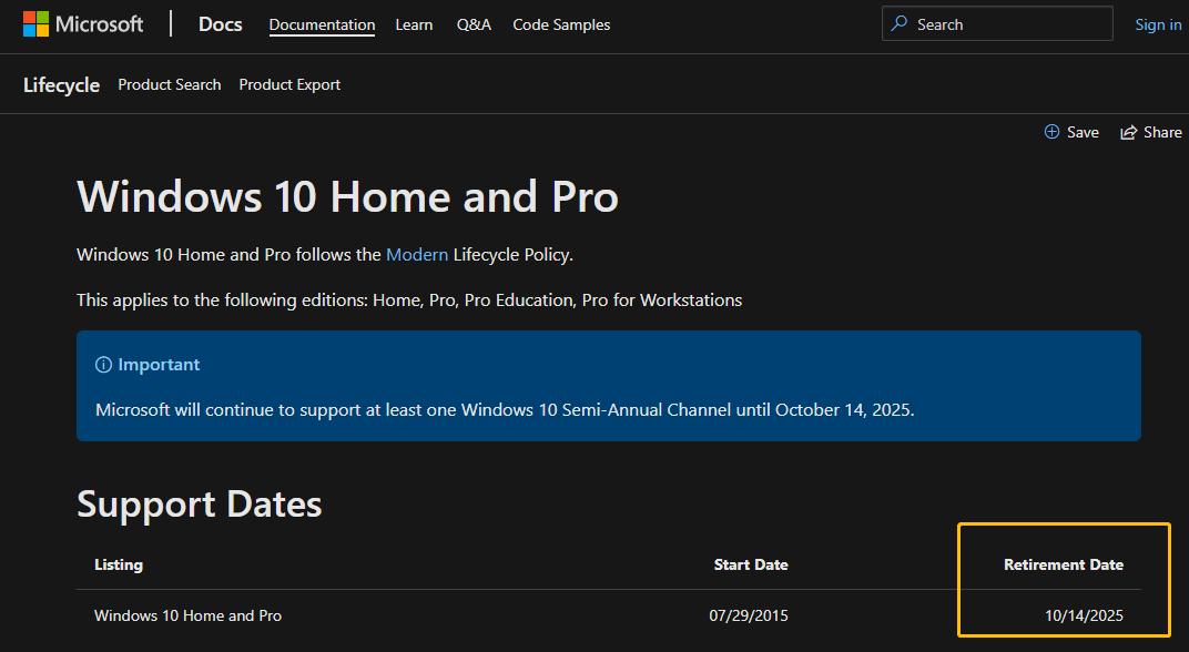 紧接着,微软前几天突然更新了 Windows 10 的产品生命周期[2],将于2025年10月14日正式结束 Win10 家庭版和专业版的技术支持: