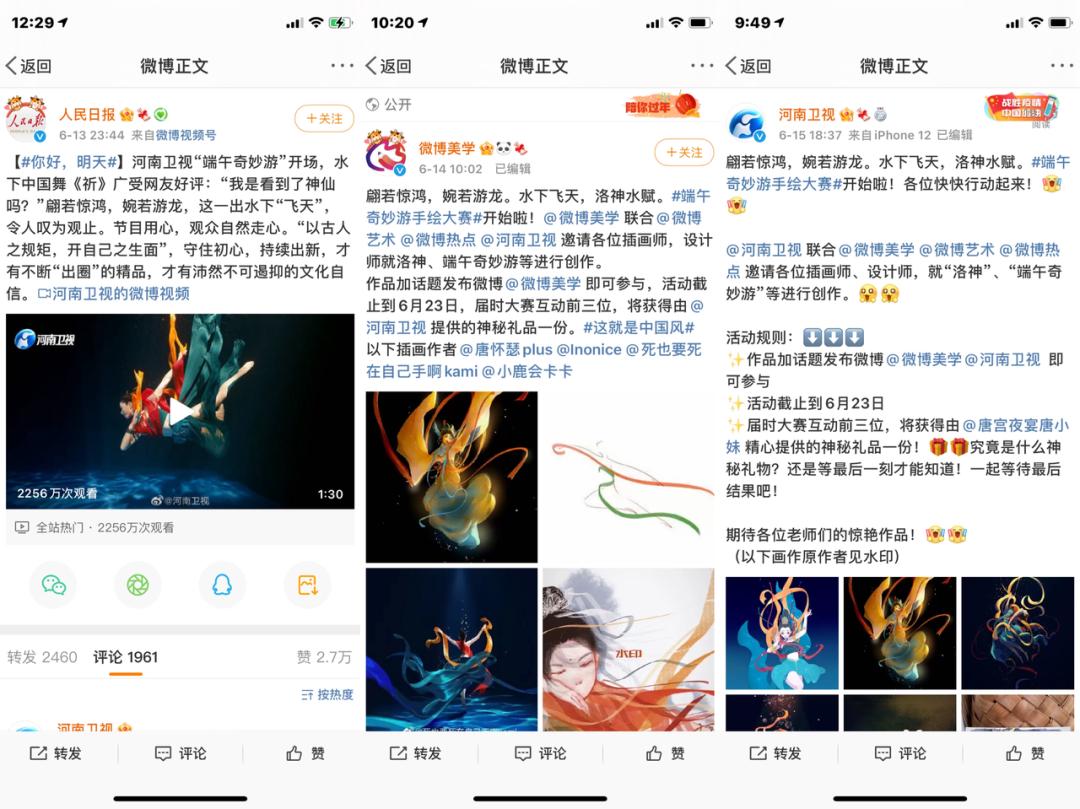 主创团队恰到时机的回应,既体现了创作者的用心,也将广大用户的“文化自信”情绪氛围烘托到另一个高度。于是,用户们纷纷自发开启了第二轮、第三轮转发,将晚会的影响力和热度又进一步延续。同时在微博上,#端午奇妙游手绘大赛#也随之被发起,网友、插画师、设计师都参与到晚会内容的二创之中,截至目前该话题阅读量已突破了1.3亿。