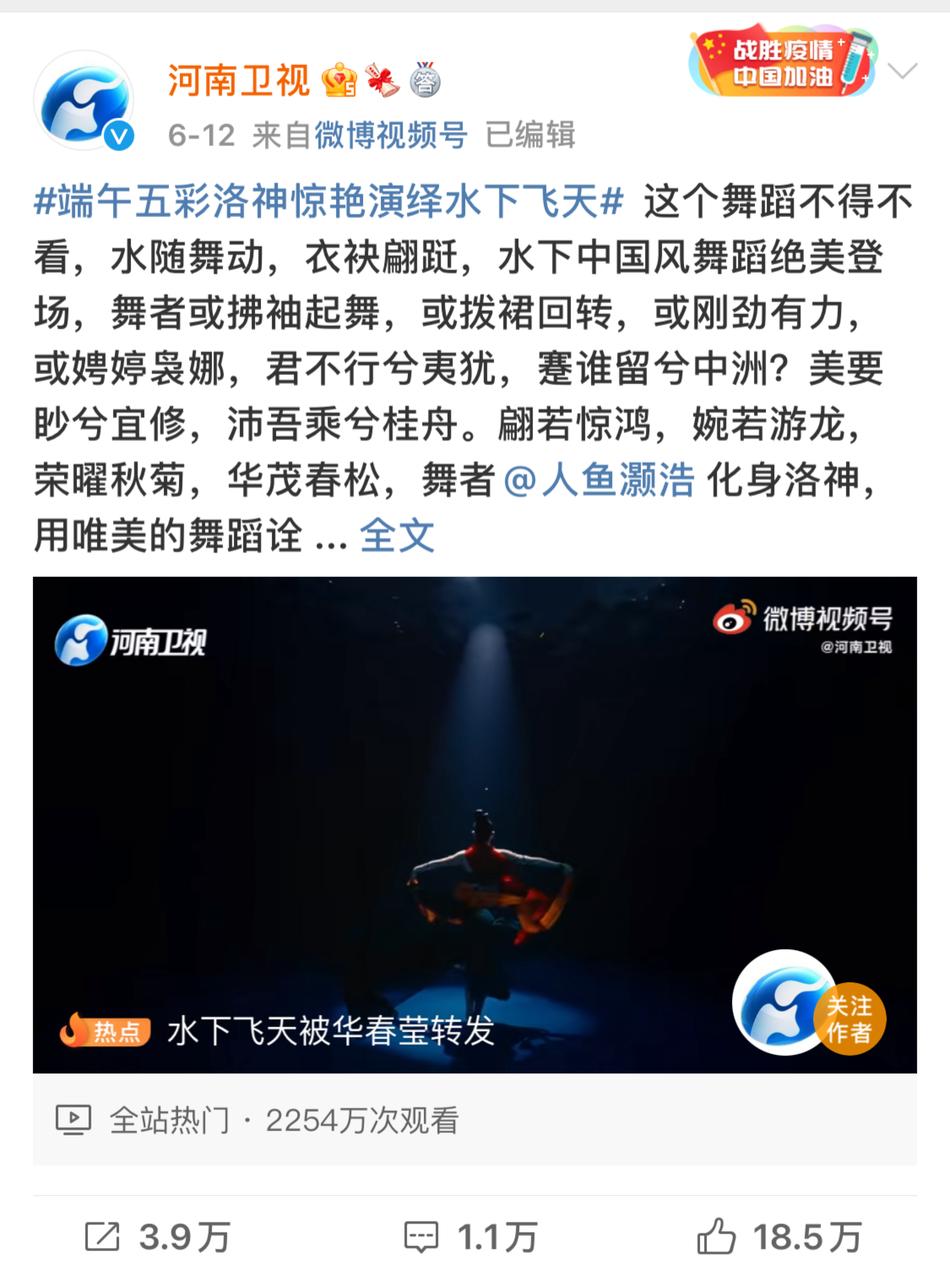 而互动性、传播性优质的互联网平台也为晚会后续热度的提升提前创造了相对良好的传播环境。以节目《祈》为例,截至目前河南卫视在微博所发布的视频就已经获得了超过2000万的播放量,转发量达到3.9万,点赞量也突破了18万。