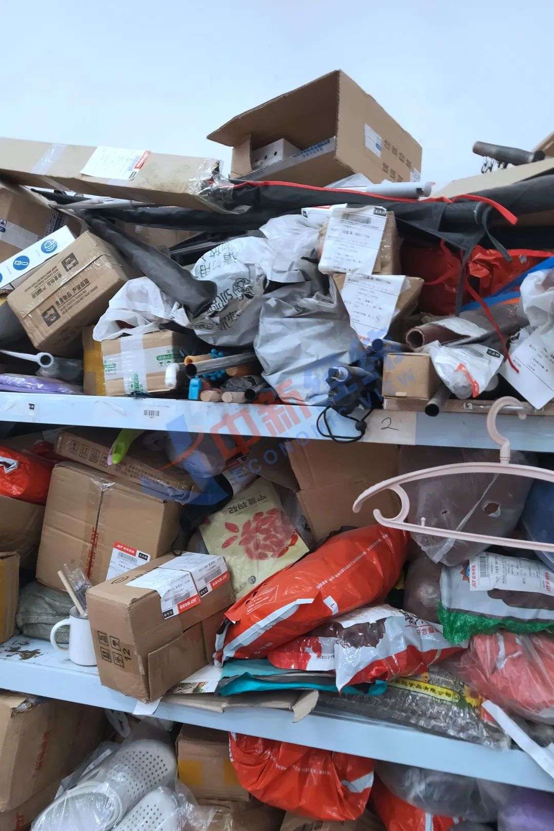 ▲货架上无人认领的快件,被当作快递盲盒售出