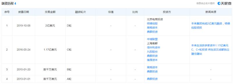 然而,天眼查信息显示,本来生活成立至今仅完成了4轮融资,最近一次融资停留在2019年10月,距今已有近两年时间。