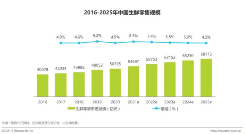 近年来,中国生鲜零售市场保持稳步增长。据艾瑞咨询发布的《2021年中国生鲜电商行业研究报告》显示,2020年中国生鲜零售市场规模超5万亿元,预计到2025年将增至6.8万亿元。