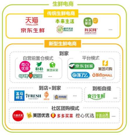 目前,生鲜电商企业也呈现出各自的运营模式,包括以京东到家为代表的O2O平台模式,以盒马为代表的仓店一体化模式,以兴盛优选、多多买菜代表的社区团购模式,以每日优鲜、叮咚买菜为代表的的前置仓模式。