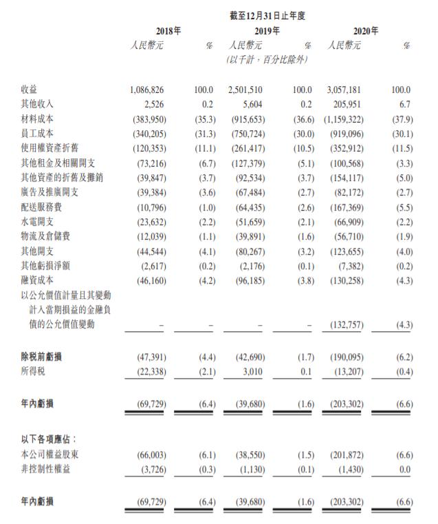 2018年,奈雪的茶亏损6973万元,2019年亏损收窄至3968万元,2020年净亏损2.03亿元,同比大幅扩大。此外,就2018年及2019年的同店而言,奈雪的茶同店利润率于2018年及2019年维持稳定,分别为24.9%及25.3%。