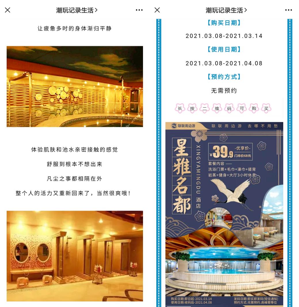 同时也在菜单栏设置优惠入口,如点击即可跳转小程序领取酒店10元的“绿色蜜汁盐浴”套餐,通过低价优惠触达新粉丝。