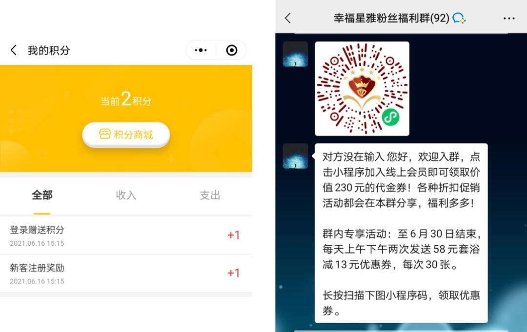 在进行私域营销时,星雅名都将商城小程序与微信公众号进行结合,探索出线上小程序的多样化营销玩法,实现精准的引流。