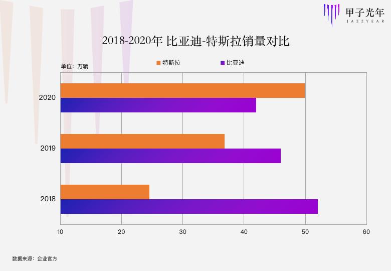 以“鲶鱼”特斯拉来做比较。2018年,比亚迪销量为52.07万辆,特斯拉为24.5万辆;2019年,比亚迪为46万辆,特斯拉为36.8万辆;2020年比亚迪销量为42万辆,特斯拉49.95万辆,被全面反超。这里提到的比亚迪销量是包括燃油车的整体销量,2019年,比亚迪新能源汽车销量为22.95万辆,特斯拉则赶超成为全球新能源销量冠军。