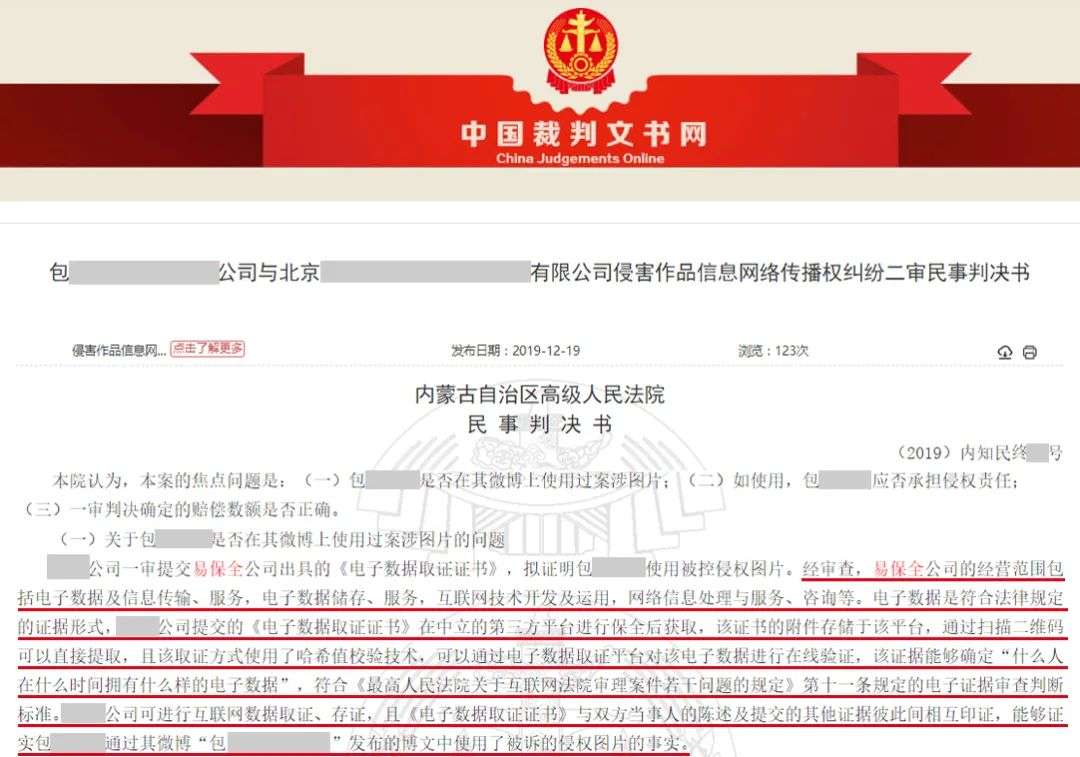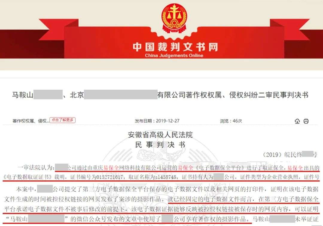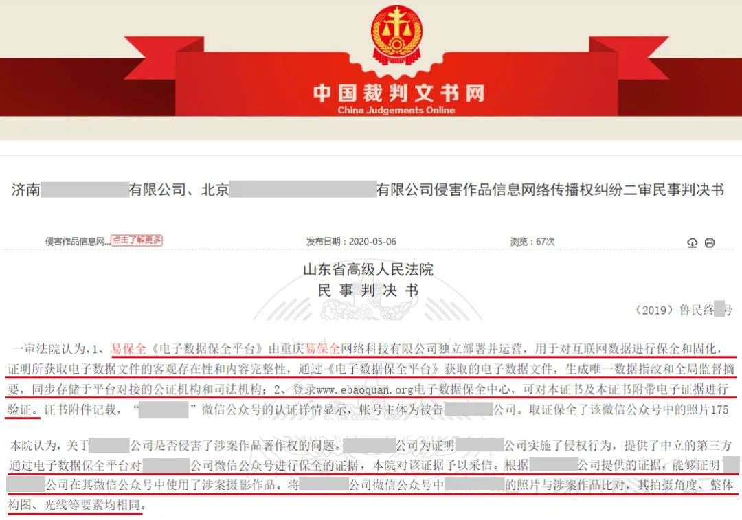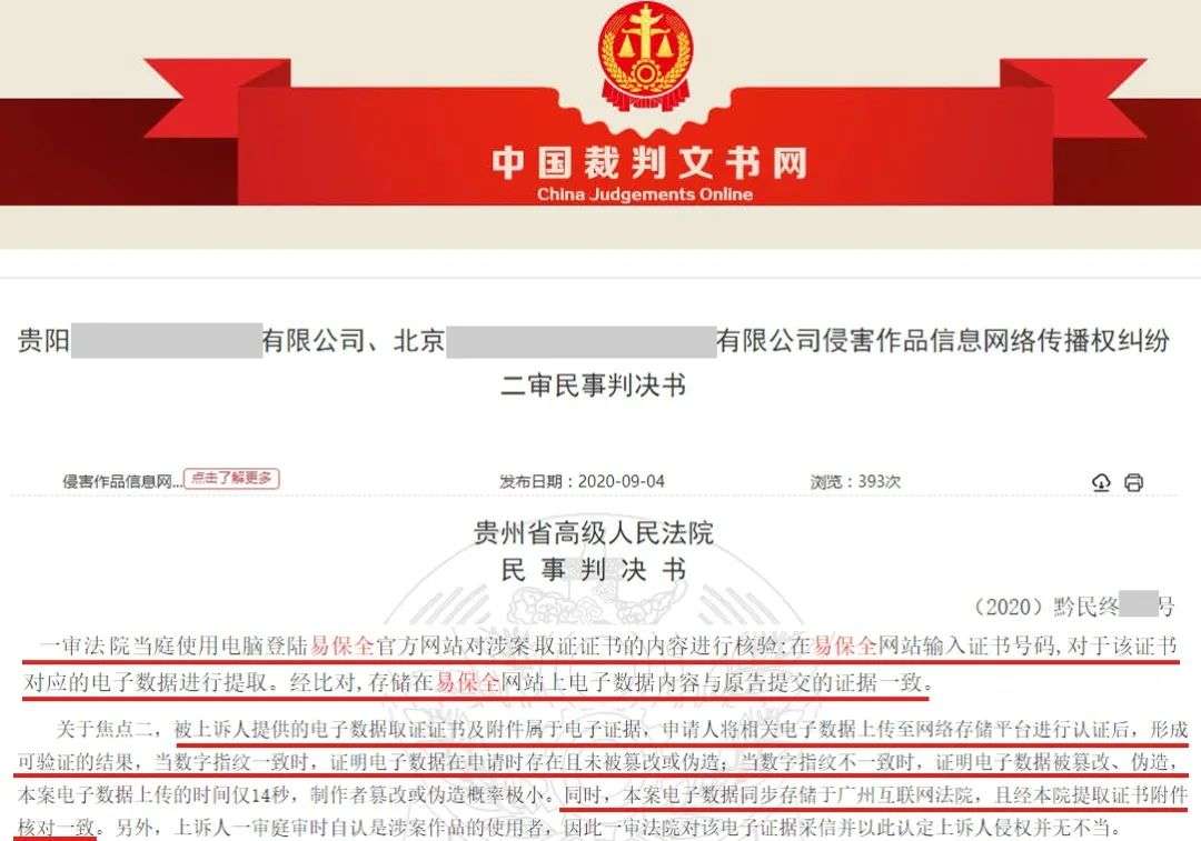 2020年,易保全旗下区块链知识产权保护平台——微版权,被内蒙高院、无锡中院等法院纳入典型案例,官宣采信微版权的区块链证据。根据中国裁判文书网显示,微版权已被山西、福建、内蒙、贵州、山东、安徽等多地高院明确官宣采信。