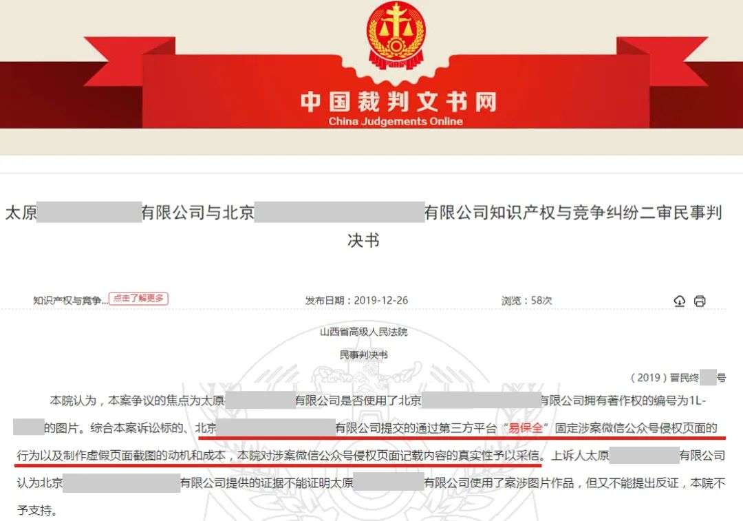 山西高院认为:综合本案诉讼标的、原审原告提交的通过第三方平台“易保全”固定涉案微信公众号侵权页面的行为以及制作虚假页面截图的动机和成本,本院对涉案微信公众号侵权页面记载内容的真实性予以采信。