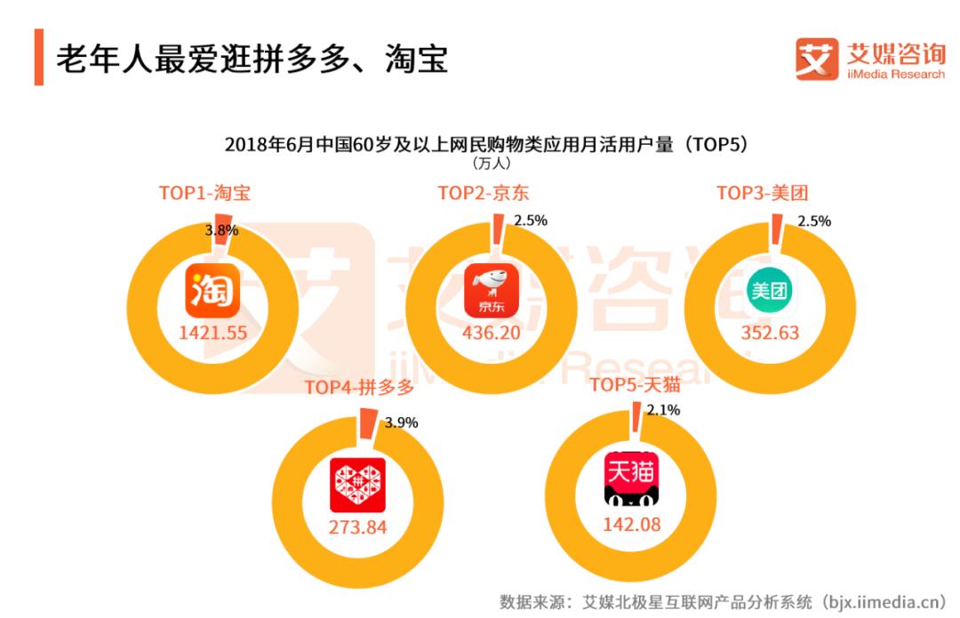 虽然没有老年人的数据体现。但结合艾媒咨询2018年6月的研究报告,发现中国60岁以上网民购物类应用月活用户量的TOP5排名中,拼多多的占比为3.9%,排在淘宝、京东等老牌互联网企业之前。