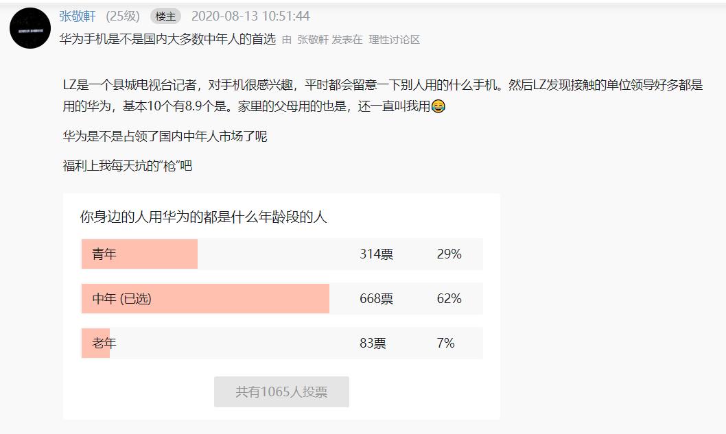 去年8月,“直男社区”虎扑上有一个高阅读量和高参与度的帖子,有人提问说:“华为手机是不是国内大多数中年人的首选”?并给出了青年、中年、老年三个选项。结果一千多人中,有62%的人都投向了中年这个选项。