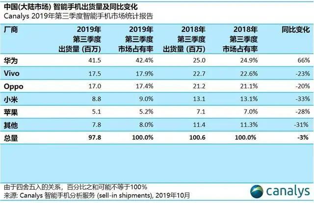 Canalys的研究数据显示,2018年Q3季度,华为在中国的市占率为24.9%,到2019年Q3季度激增到了42.4%。
