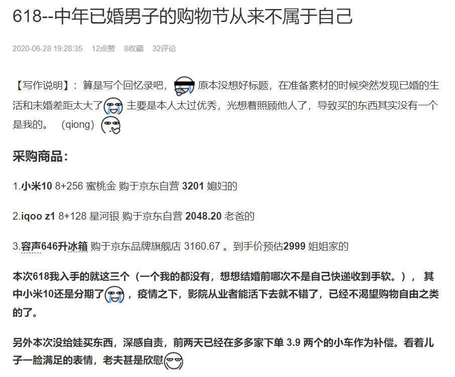历来都是如此。去年618时期,有一个网友发了一个帖子,说:中年已婚男子的购物节从来不属于自己。他列举了自己剁手的物件:小米10,价格3201元,是给媳妇的;Iqoo Z1,价格2048元,是给老爸的;容声冰箱,到手价预估2999元,是给姐姐家的……