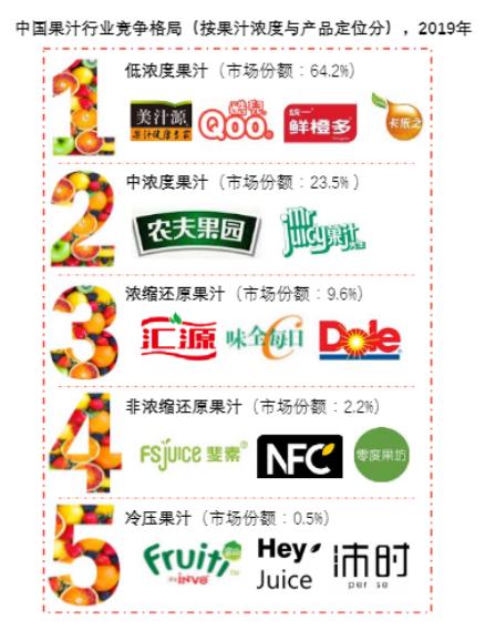 按中国果汁行业目前的竞争格局来看(2019年数据),以美汁源、鲜橙多为主的低浓度果汁占据64.2%的市场份额,以农夫山泉旗下农夫果园为代表的中浓度果汁占据23.5%的市场份额,以汇源、味全每日C为代表的浓缩还原果汁占据9.6%的市场份额,而上面提到的NFC果汁和HPP果汁总市场份额不到3%。