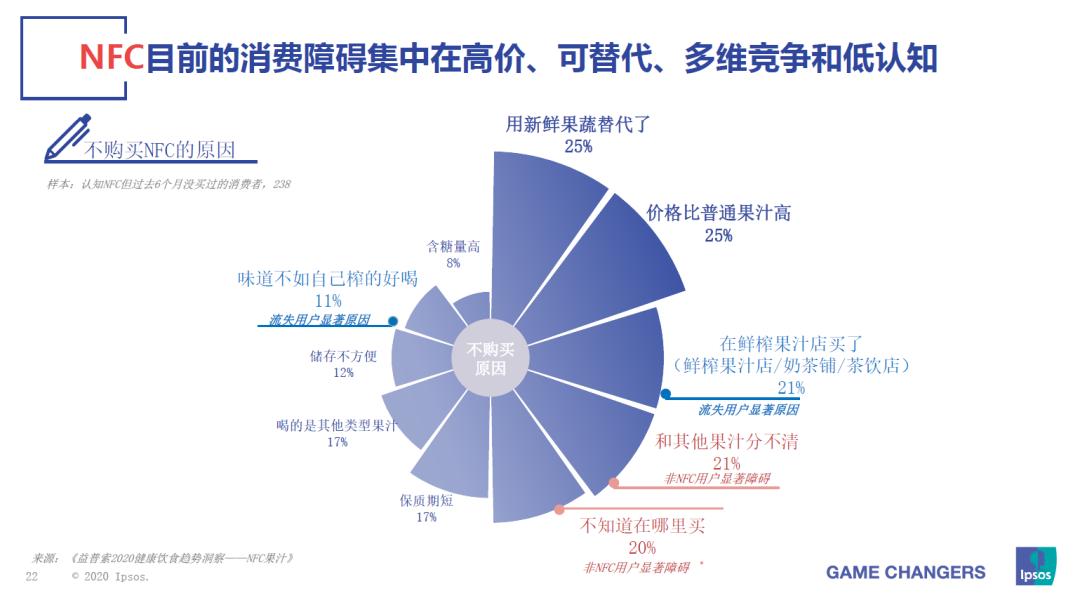 根据益普索发布的2020NFC果汁洞察报告,中国消费者不购买NFC的主要原因集中在“用新鲜果蔬替代”“价格比普通果蔬高”“在新茶饮店/果汁店买了”,高价、可替代性强、多维竞争让认知度本就不高的NFC果汁难以迅速拓展。