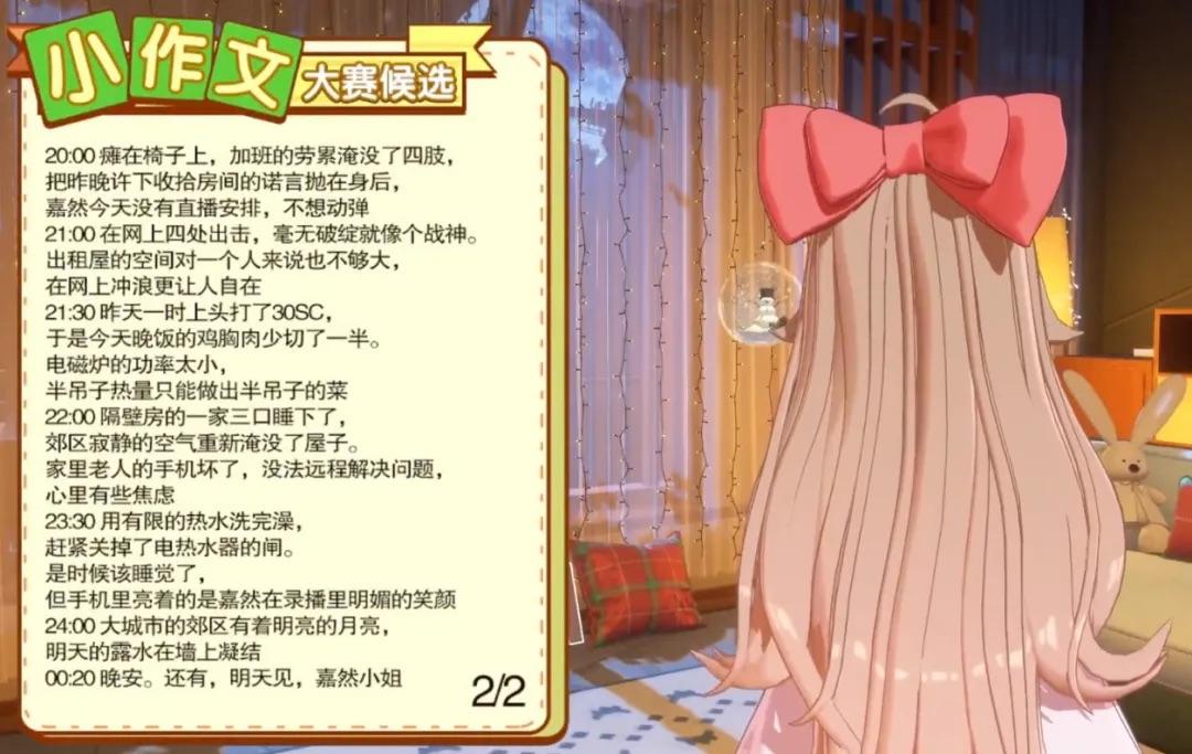 和真人偶像一样,粉丝在虚拟偶像身上投射着真情实感。人们渴望治愈、共情和陪伴,这种情感投射与对真人偶像的感情并无二致。在粉丝写给嘉然的小作文里,抚慰社畜疲惫生活的,正是嘉然明媚的笑容。如果把嘉然的名字换成任何一位真人明星,相信都有粉丝来认领这份偶像带来的治愈。