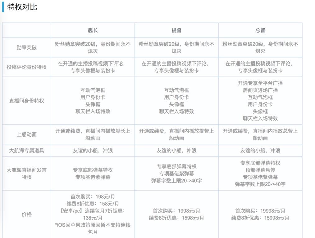 “上了主播的船,主播就是你的人啦”,船票带来的是专属道具、专属道具、个性装扮、勋章、入场特效、身份卡片、弹幕特权、上传动画等特权。票价较舰长贵了10倍的提督,在上述基础上增加了“弹幕可输入40字”的发言特权;而接近2万/月换来的总督身份,多出来的特权还有另外三项权益。换句话说,在UP主的大航海中,的确是靠粉丝用爱来驱动的。