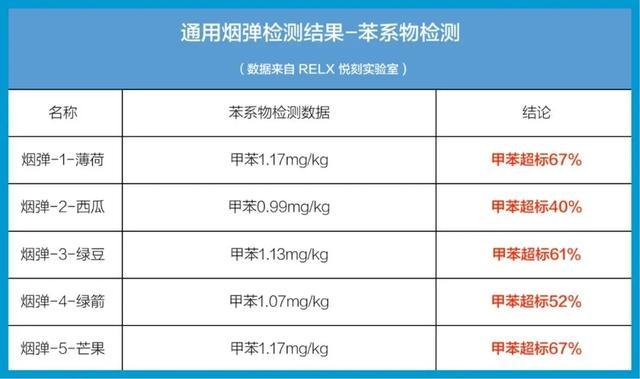 有害物超标、质量无保障、包装信息不全、未标注烟油成分、尼古丁含量虚标等是通用烟弹存在的普遍问题。 悦刻曾对一批市面上流行的通用烟弹进行抽检,发现该类产品普遍使用劣质烟油,漏油情况严重,有害物特别是苯系物严重超标,且实际尼古丁含量与包装所示不符。