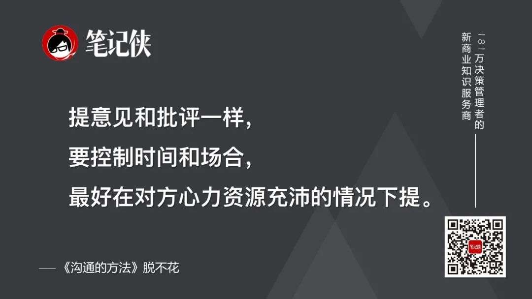 在对方愿意听取你建议的情况下,过程中也有几个注意事项:提意见和批评一样,要控制时间和场合,最好在对方心力资源充沛的情况下提。