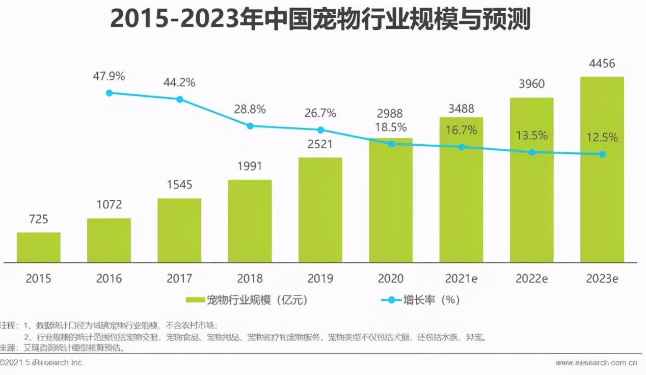 《2021年中国宠物消费趋势白皮书》显示,去年我国宠物行业市场规模接近3000亿元,未来3年行业将继续保持平稳增长,复合增速预计可达14.2%,到2023年市场规模将达4456亿元。