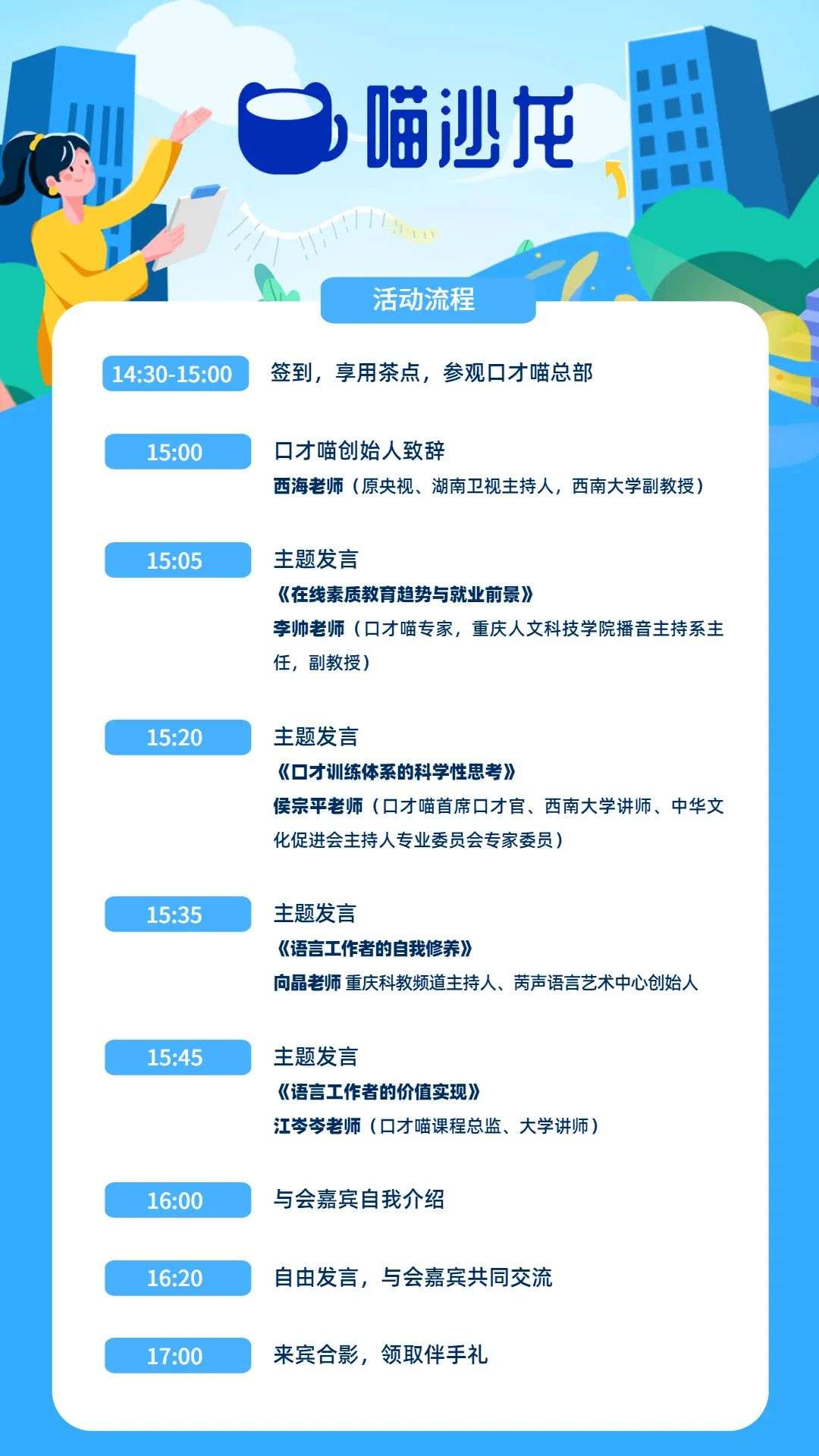 还是这群人,他们怀揣着“让人人都有好口才”的教育梦想,关注着“口才培训师资的培养”,希望建立一个口才培训行业交流平台,大家能以开放&包容心态畅所欲言。于是——“喵沙龙”,应运而生。