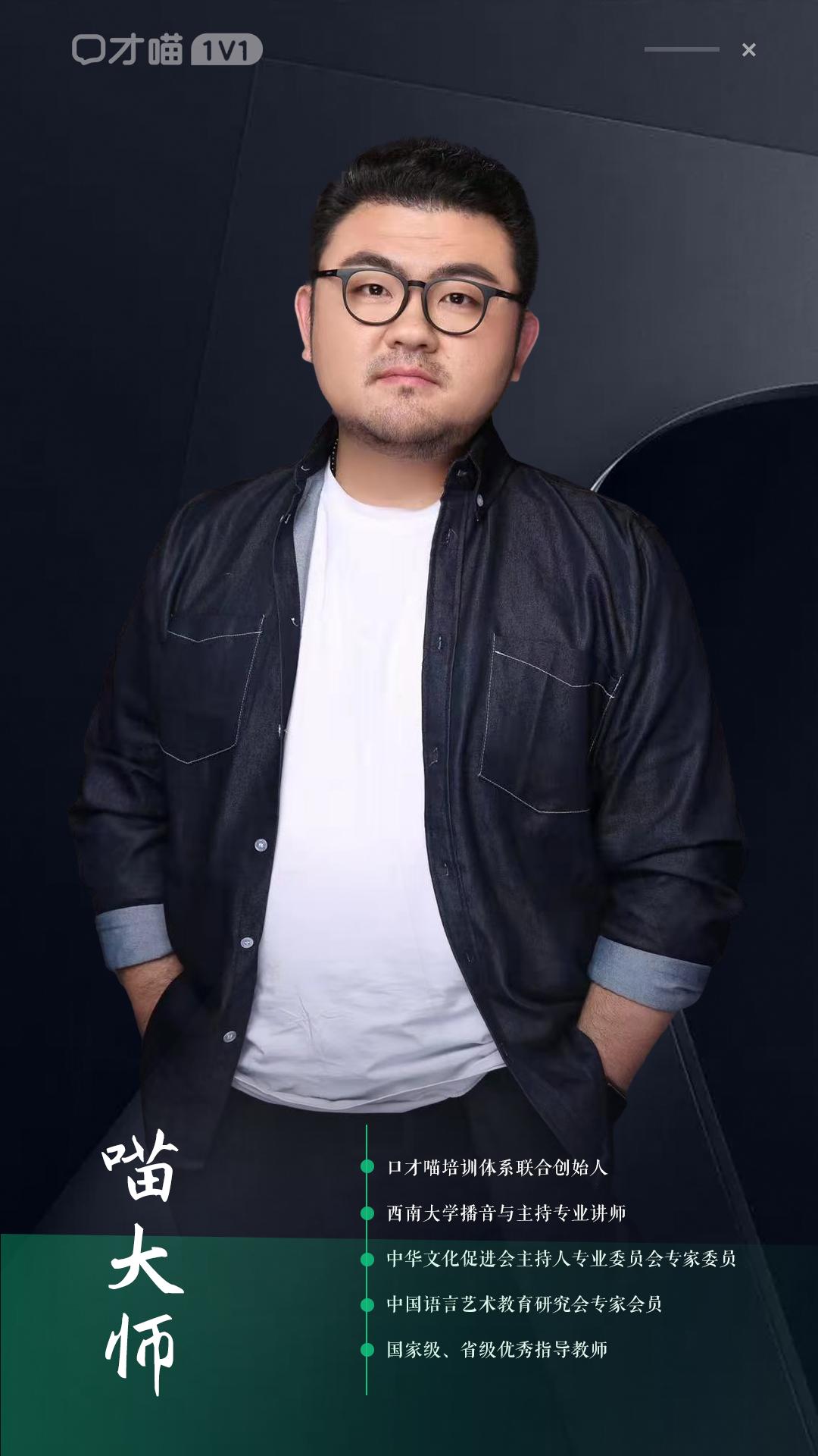 胖胖的“喵大师”是『口才喵1V1』首席口才官,也是『口才喵1V1』培训体系联合创始人、西南大学播音主持专业讲师、中国语言艺术教育研究会专家会员等多重身份。他有着让人印象深刻的大师形象,像功夫熊猫一样,萌萌哒的外表下藏着一身好武艺。