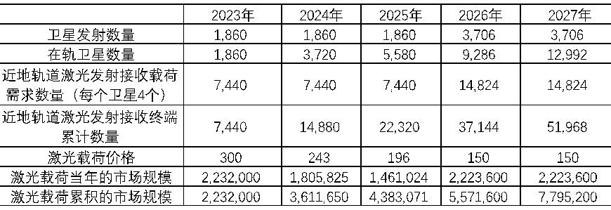 2. 每颗卫星上激光终端数量:一个卫星一般有4套激光发射接收终端,有3个可能是作为备份,1个是正常使用,且随着技术的进步未来一个卫星的终端数量可能是会下降的,但卫星型号一旦定型以后,它更改的可能性不是很大。本文认为,出于性能稳定以及国家对成本控制要求不高的考虑,在5年内转变型号的可能性不大,所以预计每个卫星会搭载4套激光终端。(但激光终端的数量应该在2~4个左右,最大的情况是4个)