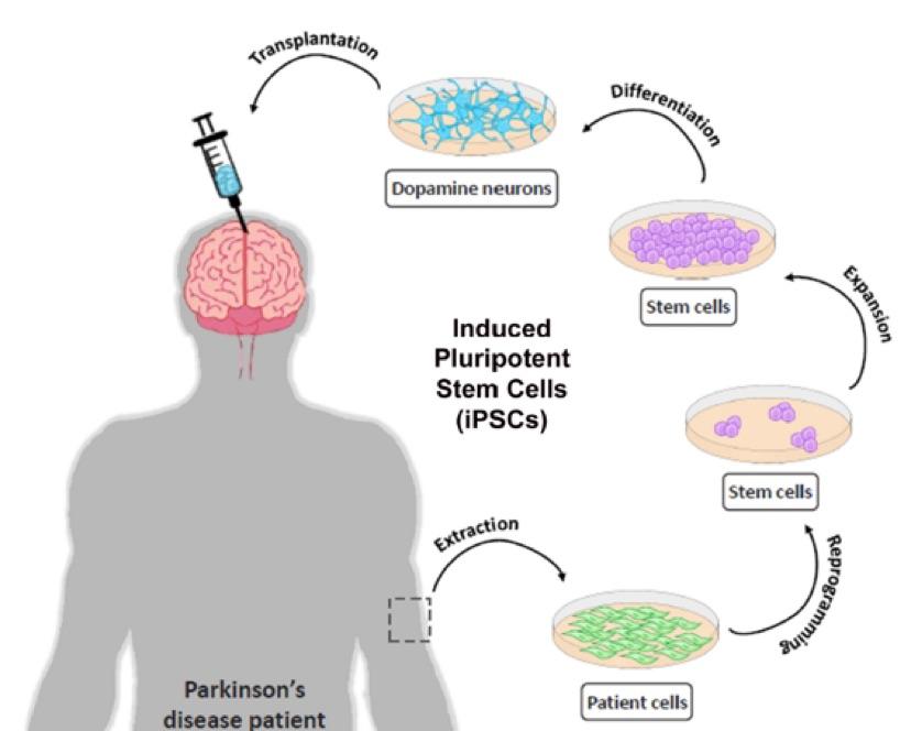 利用多潜能干细胞技术治疗帕金森症的流程 (图片来源:《Stem cell therapy for Parkinson’s disease》)