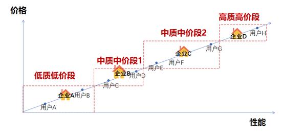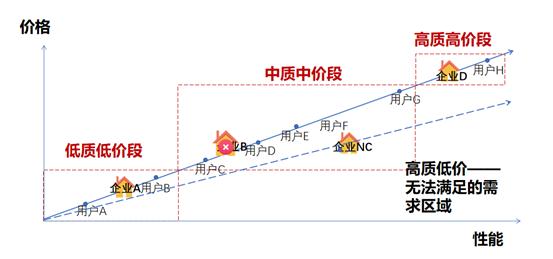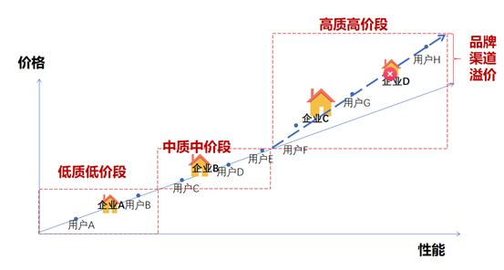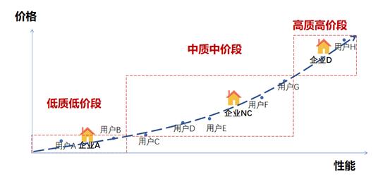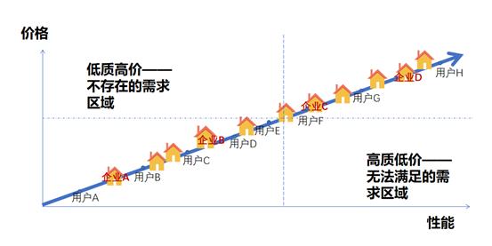 价格与性能这一对维度属性在工业品中是严格互斥的,正常情况下,要么“高质高价”,要么“低质低价”,性价比可以近似地认为是一条向右上方的斜线,所有的需求方与供给方都分布其中。