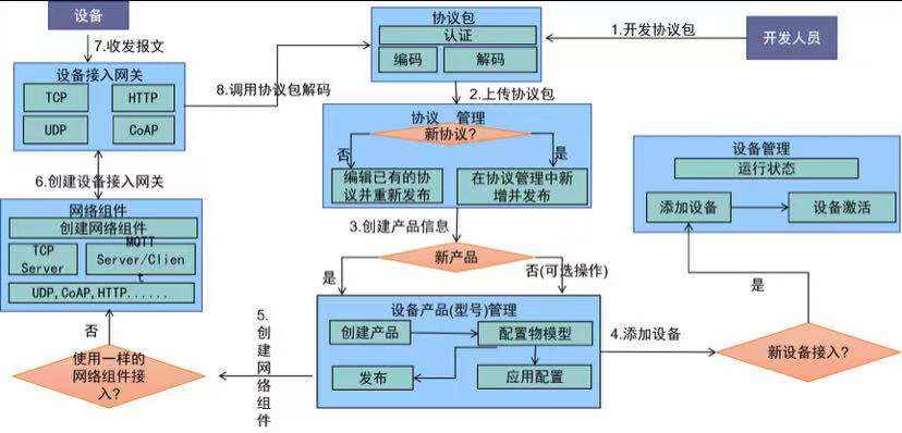 上图是拓维信息泛 IoT 平台的设备接入流程图。该平台具有设备协议适配多、网络连接方式多、设备接入方法多、边缘计算功能多、安全保障防范多等特点。