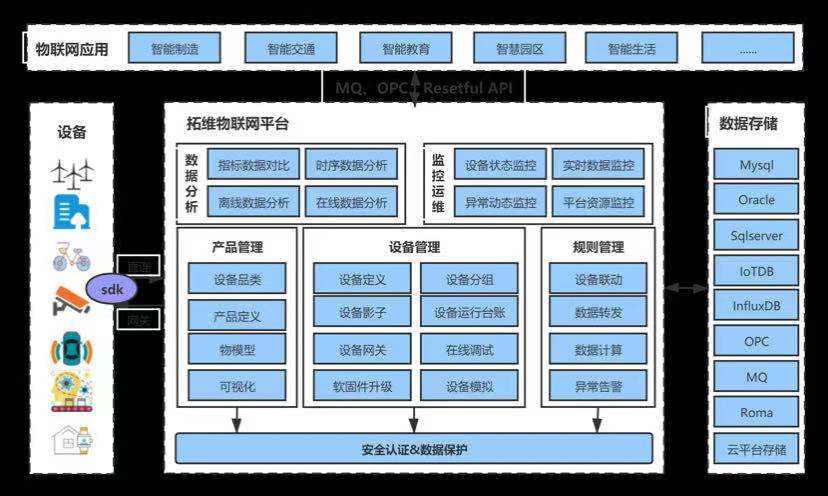那么,拓维信息泛 IoT 平台所具有的这些特性构建的基础是什么?它又如何让设备“说话”(输出有效数据),并对设备端上传的海量数据进行有效的加工处理、高效存储和分析应用呢?
