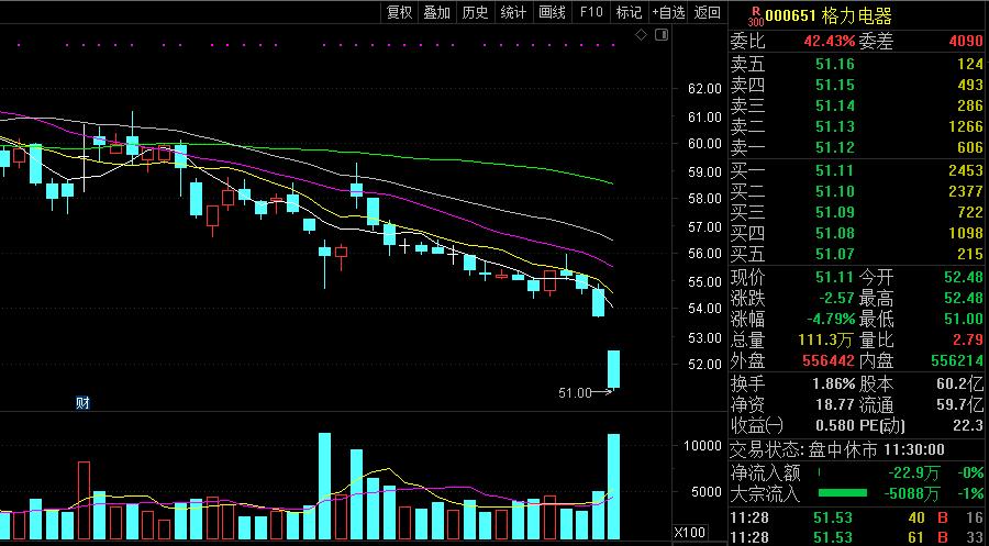 6月21日,格力电器暴跌4.79%,股价为51.11元,较此前一个交易日跌去了2.57元。